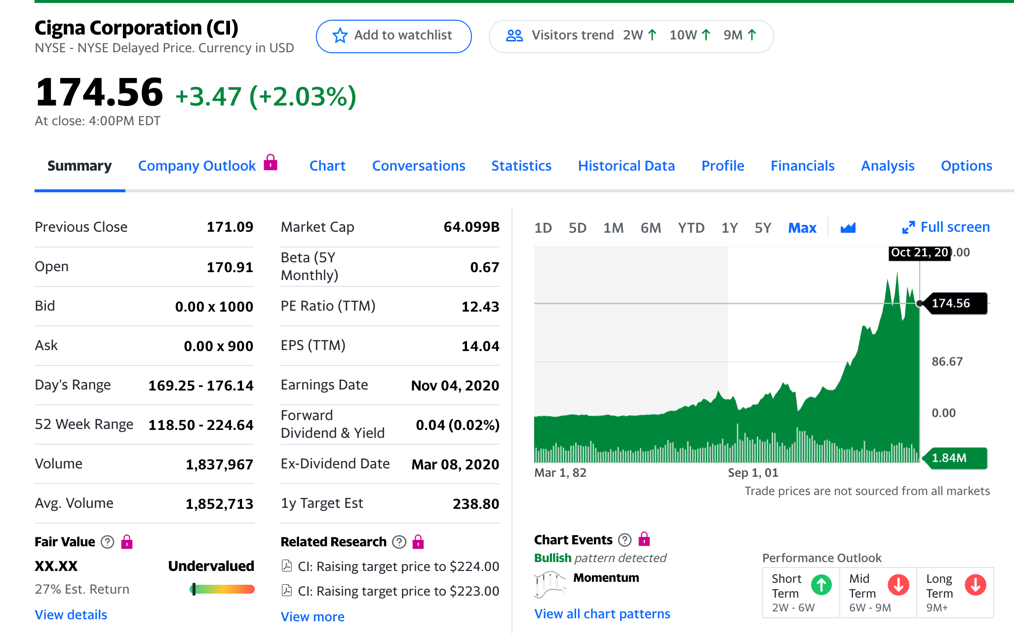 If we look at it today (Oct 21, 2020, a month later), the stock price went up +3.43% in just a month, and it is at $174.56.